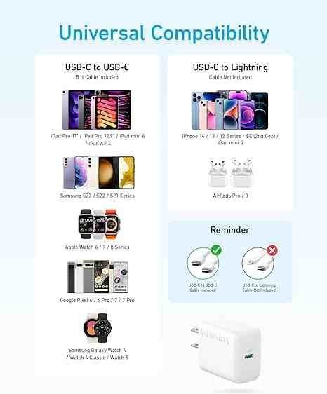 With its extensive compatibility, this charger is the perfect solution for charging phones, tablets, and more. (Please note that USB-C to Lightning cable is not included.)
