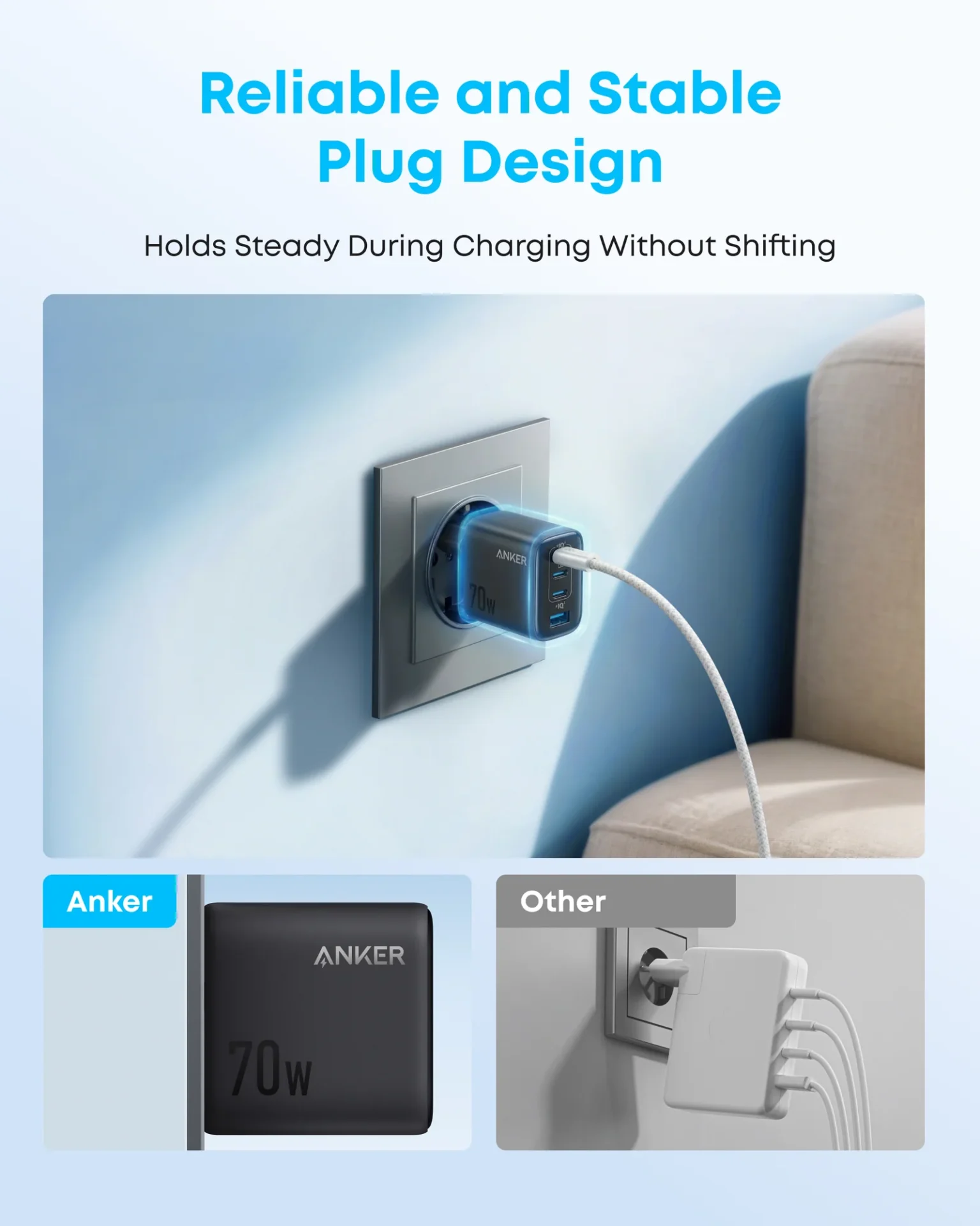 Its advanced GaN technology ensures faster charging with lower heat, while intelligent power distribution automatically delivers the right amount of power to each connected device. The compact, stable design saves outlet space and stays firmly plugged in, making it ideal for home, office, and travel. Backed by Anker’s ActiveShield™ safety system, it delivers reliable, cool, and worry-free charging every day.